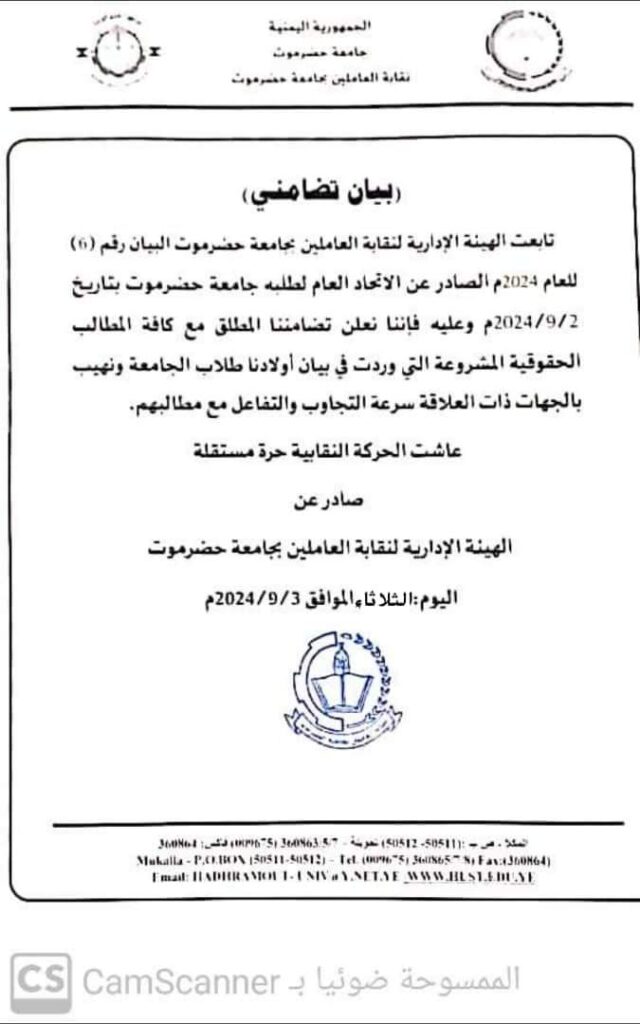 نقابة العاملين بجامعة حضرموت تعلن تضامنها مع مطالب اتحاد طلبة الجامعة