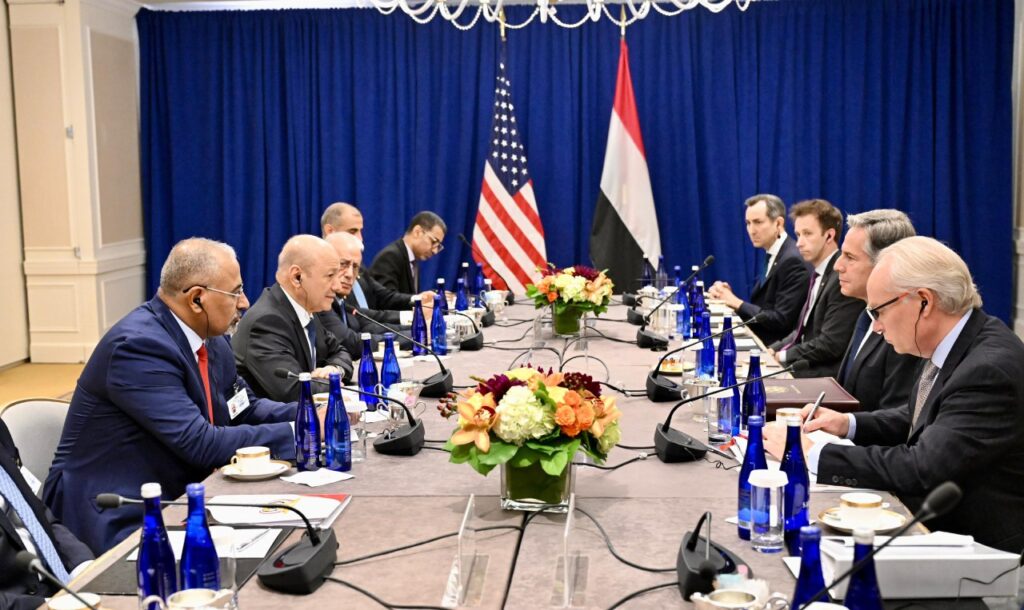 رئيس مجلس القيادة الرئاسي يبحث مع وزير الخارجية الاميركي العلاقات الثنائية وفرص احياء السلام في اليمن